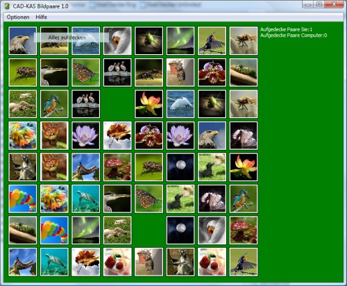 Finden Sie die jeweils passenden Bildpaare aus den 64 zugedeckten Karten. Jeweils zwei Karten können von Ihnen nacheinander aufgedeckt werden. Wenn die zwei Karten übereinstimmen, werden die Karten entfernt und wandern auf Ihren Stapel. Dann ist der Computergegner dran. Wenn die Karten nicht übereinstimmen, werden die Karten wieder umgedreht und das Motiv somit verdeckt. Ziel ist es sich möglichst die Position von vielen Bildern einzuprägen, damit man beim Aufdecken ein einer Karte die passende zweite Karte umdrehen kann. Wer das bessere Bildgedächtnis hat gewinnt. Der Computer merkt sich bis zu 15 Kartenpositionen.