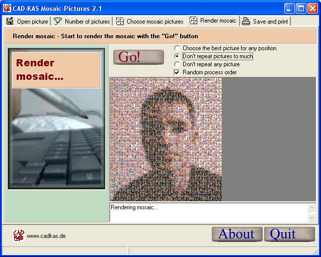 You only select the folder with your photos to take as mosaic stones. Then the program can render any photo of your choice only with this mosaic stones.