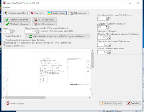 Scannen Sie eine Zeichnung ein oder laden Sie eine Bilddatei von der Festplatte. Das Programm versucht dann die Linien von erkennen und als DXF Datei zu speichern. Die Version 2.0 erzeugt immer zusammenhängende Polylines.