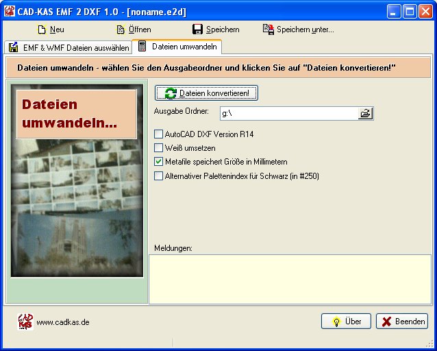 Konvertieren Sie EMF und WMF Dateien in das DXF Format. Sie wählen einfach die EMF und WMF Dateien und das Zielverzeichnis aus. Dann konvertiert das Programm beliebig viele EMF/WMF Dateien auf Knopfdruck.