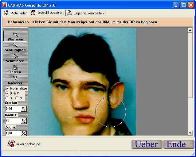 Das Ergebnis kann ausgedruckt und gespeichert werden. Verfremden Sie Fotos auf kuriose und skurrile Art und Weise. Import zahlreicher Grafikformate möglich. Stärke und Radius der Effekte können vielfältig variiert werden.