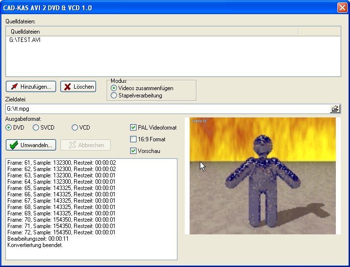 Erstellen Sie Ihre eigenen DVD's oder Video-CDs (VCD oder SVCD) nun ganz einfach! Sie wählen einfach die AVI und MPG Videos zum Konvertieren und das Zielformat aus. Das Programm konvertiert dann alle Videos nacheinander oder fügt alle Videos zu einem großen Video zusammen. Die erzeugten MPG Dateien entsprechen der Norm für DVD's, Video-CDs oder Super-Video-CD's und können dann mit Ihrem CD-Brennprogramm ganz einfach gebrannt werden.
