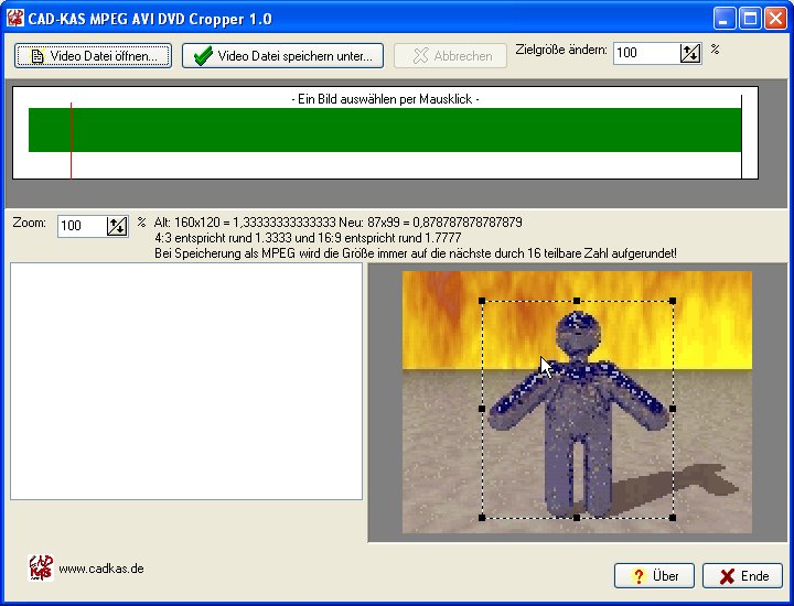 Beschneiden und ändern Sie das Bildformat von Filmen. Entfernen Sie unerwünschte Bildteile wie z.B. die schwarzen Streifen am oberen und unteren Bildende oder gleich das Sender-Logo und Untertitel mit, indem Sie den sichtbaren Bildbereich vom Film zurecht schneiden. Sie können also oben, unten, links und rechts einen beliebig großen Bereich vom Bild wegschneiden. Sie können so z.B. eine 4:3 in 16:9 Umwandlung und umgekehrt durchführen. Sie können das Bild auch skalieren, d.h. die Breite und Höhe in Bildpunkten vergrößern oder verkleinern.