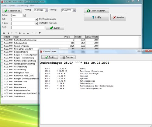 Für Ihre Auswertungen stehen Ihen zwei Mittel zur Verfügung: Die Saldenliste zeigt die Summer der Buchungen für einen bestimmten Zeitraum, also einen Überblick über Ihre Ausgaben und Einnahmen. Die Kontenliste schlüsselt alle Buchungen nach Konten sortiert auf. Die Kontenliste wird in einer PDF Datei konten.pdf im Programmverzeichnis abgelegt. Das installierte PDF Anzeigeprogramm wird aufgerufen und die PDF Datei wird geöffnet.