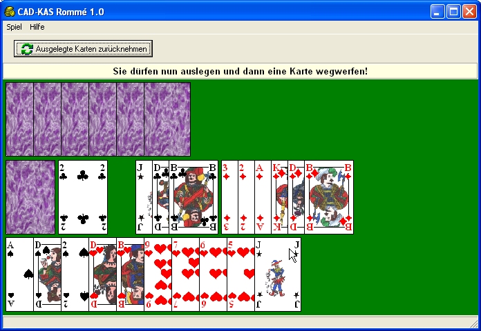 Beim ersten Auslegen muss man mindestens 30 Punkte auslegen, dabei zählen Bube, Dame und König je 10 Punkte, dass Ass zählt 11 und die Zahlenkarten entsprechend Ihrer Zahl. Man kann also z.B. mit Bube, Dame, König raus, aber nicht mit 9, 10, Bube, weil dies nur 29 Punkte sind. Wenn man einmal ausgelegt hat, gibt es keine Punkte Begrenzung mehr und man kann auch an bereits ausgelegte Karten weitere passende Karten anlegen. Der Joker kann eingesetzt werden, um fehlende Karten in einer Serie oder Gruppe zu ersetzen.