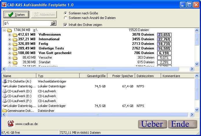 Fragen Sie sich auch manchmal, warum Ihre Festplatte schon wieder voll ist und woher die ganzen Daten gekommen sind und wo sich diese verbergen? Das Programm hilft Ihnen beim Aufräumen Ihrer Festplatte. Es listet alle Verzeichnisse sortiert nach der Größe der darin enthaltenen Daten und nach der Anzahl der darin enthaltenen Dateien auf. Sie sehen also sofort, was besonders viel Platz beansprucht und was Sie davon nicht mehr benötigen, können Sie dann auch gleich in den Papierkorb verschieben.