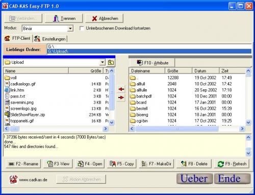 Easy-FTP ist ein FTP-Client zum Übertragen von Dateien zwischen einem PC und einem FTP-Server. Sie können so z.B. Dateien zu Ihrer Homepage hochladen oder Dateien von öffentlichen FTP-Servern downloaden. Das Programm beherrscht die Wiederaufnahme abgebrochener Downloads, das Löschen kompletter Verzeichnisbäume auf dem Server. Eine komfortable Serververwaltung steht zur Verfügung. Oft benutzte Ordner sind durch die "Lieblingsordner" per Mausklick erreichbar. Dateien auf dem Server können mit der "Edit" Funktion heruntergeladen, geändert und sofort wieder hochgeladen werden. Die speziellen Dateiattribute für CGI-Scripts können per Mausklick gesetzt werden.