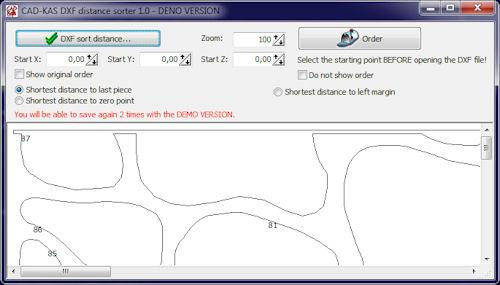 So you can optimize a DXF if you want for example cut or mill the file later on. The optimization minimizes the time needed to cut the file. You can setup a starting point in DXF coordinates before the sorting process. The program will then start with the DXF element which is the nearest to the starting point.