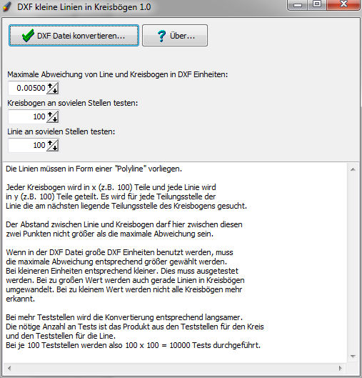Wenn in der DXF Datei große DXF Einheiten benutzt werden, muss die maximale Abweichung entsprechend größer gewählt werden. Bei kleineren Einheiten entsprechend kleiner. Dies muss ausgetestet werden. Bei zu großen Wert werden auch gerade Linien in Kreisbögen umgewandelt. Bei zu kleinem Wert werden nicht alle Kreisbögen mehr erkannt.