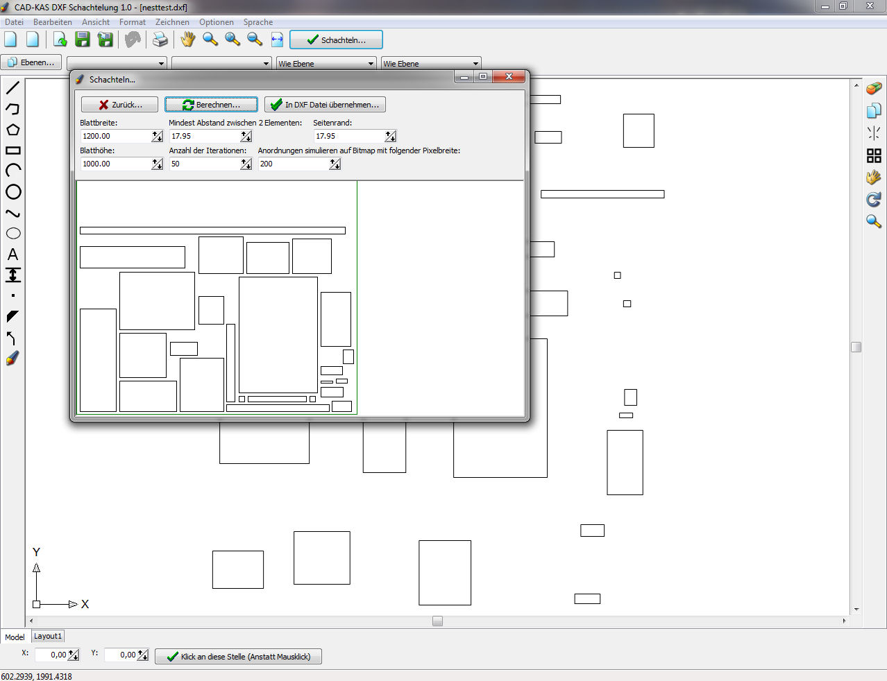 Durch Klick auf den Button "Berechnen" wird die beste Anordnung berechnet. Dann können entweder die Parameter nochmals verändert werden und eine neue Berechnung durchgeführt werden oder die Anordnung kann per Mausklick in die DXF Datei übernommen werden. Die DXF Datei kann dann abgespeichert werden.