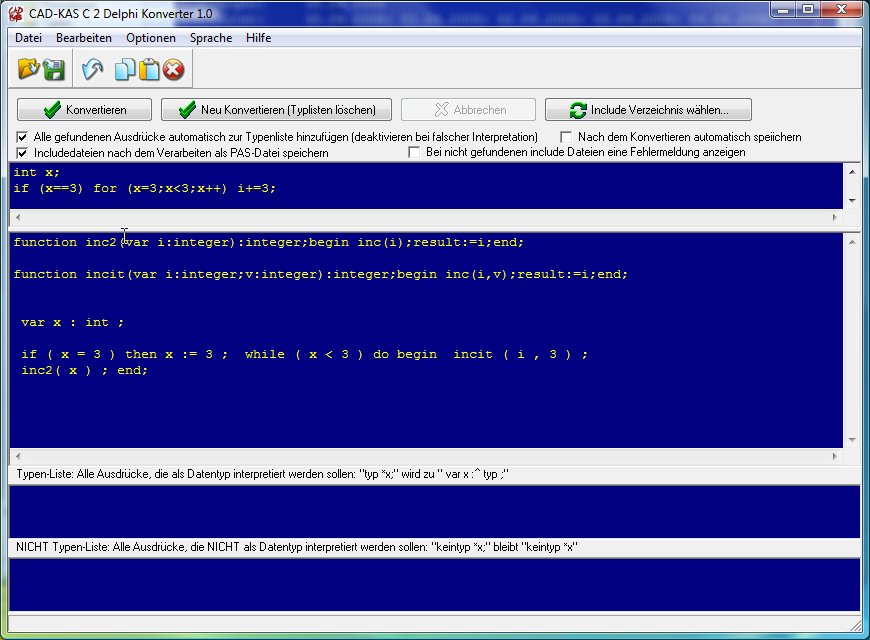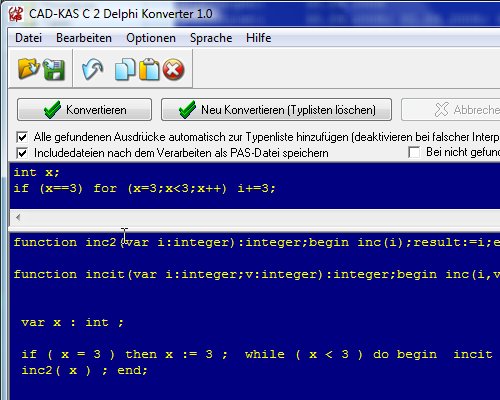 Der C Syntax wird in den Delphi/Pascal Syntax übersetzt. Sie werden sicherlich noch ein paar Änderungen durchführen müssen, um das Programm unter Delphi komplieren zu können, aber die Hauptarbeit wurde vollautomatisch für Sie erledigt.