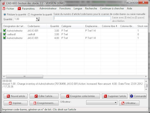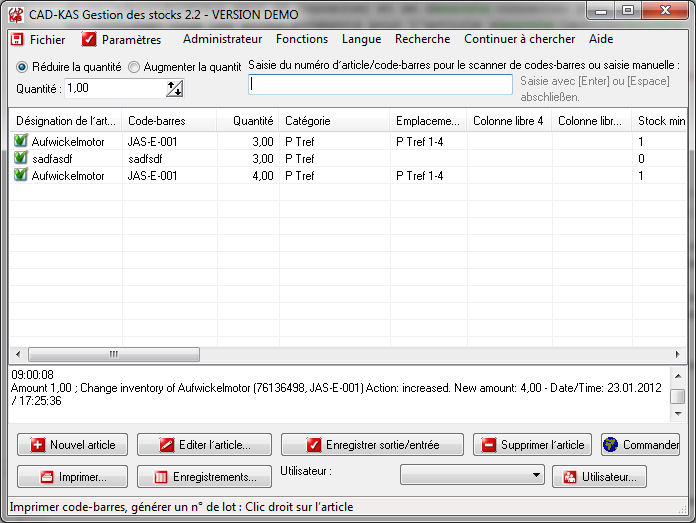 Enregistrez votre produit dans le programme avec le nom, le numéro de l'article ou un code-barres, un commentaire et la quantité. Vous pouvez ensuite enregistrer les entrées et les sorties tout simplement avec un scanner de codes-barres, avec un clic, ou en entrant le numéro de l'article (si la rapidité est de mise).
