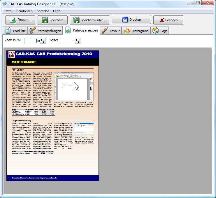 Sie können Ihr Logo in die Kopfzeile einbinden und auch für die Seiten ein Hintergrundbild hinterlegen. Der Text für die Kopf- und Fußzeile kann frei eingegeben werden. Sie legen zunächst alle Produktinformationen an und können dann das Layout noch anpassen.