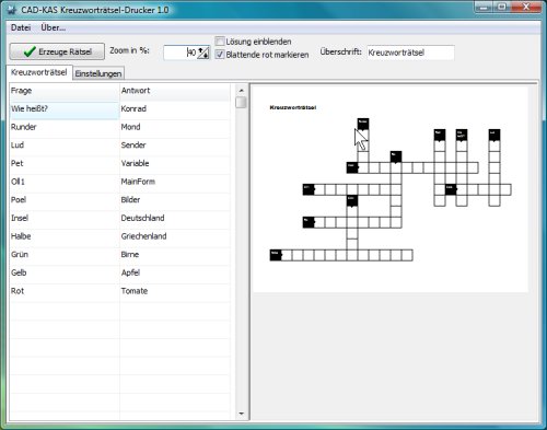 Sie müssen nur Ihre Fragen und Lösung in eine Tabelle eintragen und auf "Erzeuge Rätsel" klicken und schon erzeugt das Programm Ihr persönliches Kreuzworträtsel.