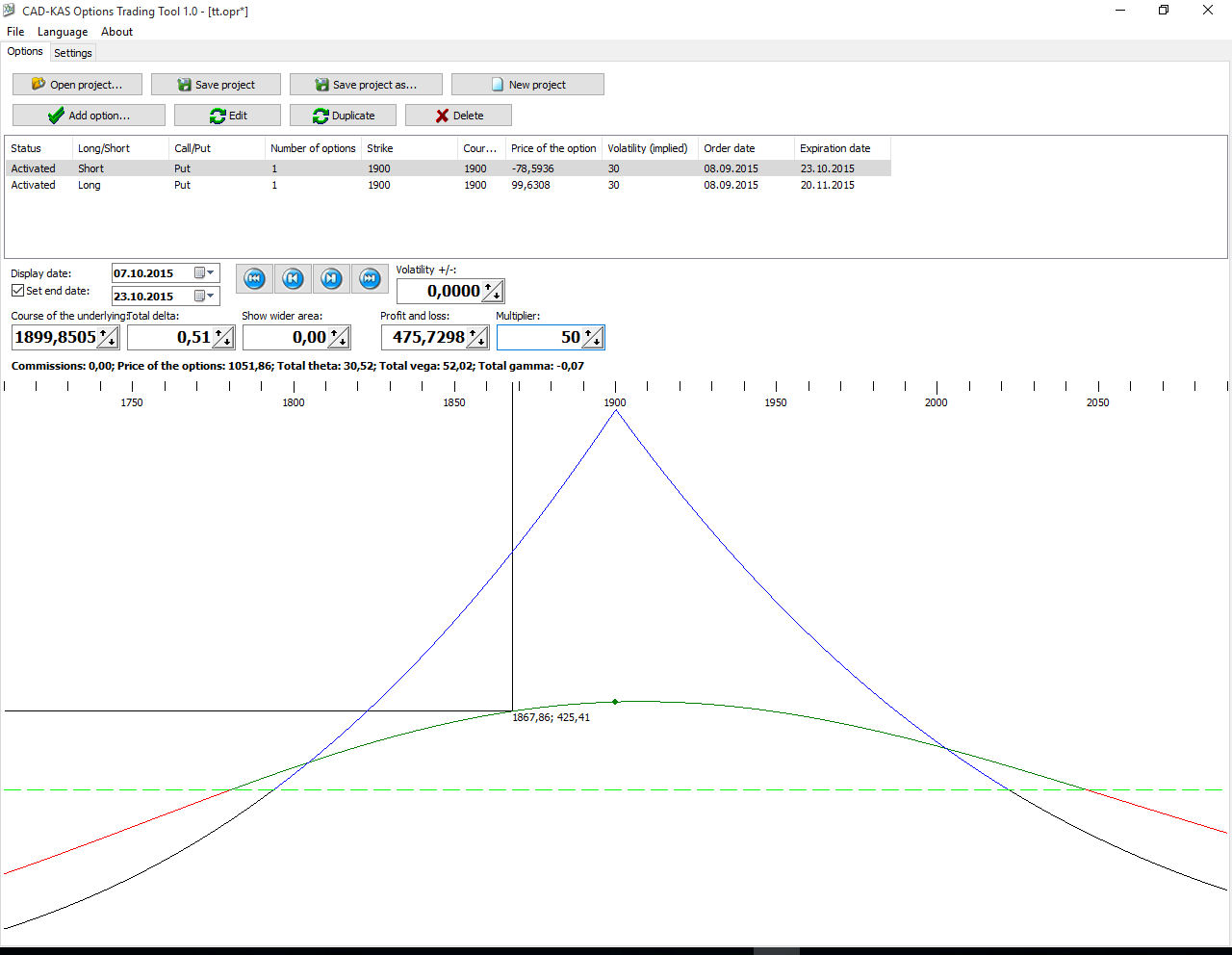 Activate and deactivate a single option to see the effect of this single option to your total position. You can setup the order commissions and the risk free interest rate. With the multiplier you select how many stocks or futures one option trades.