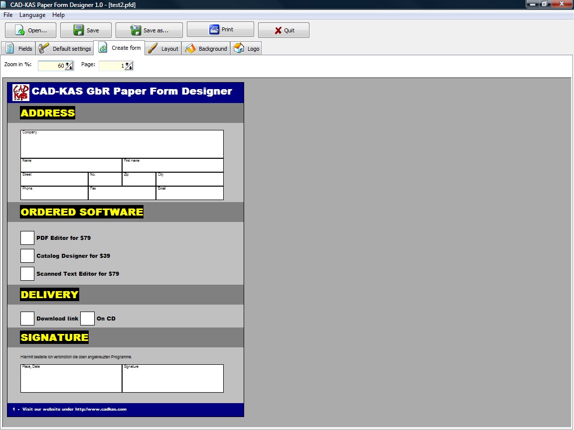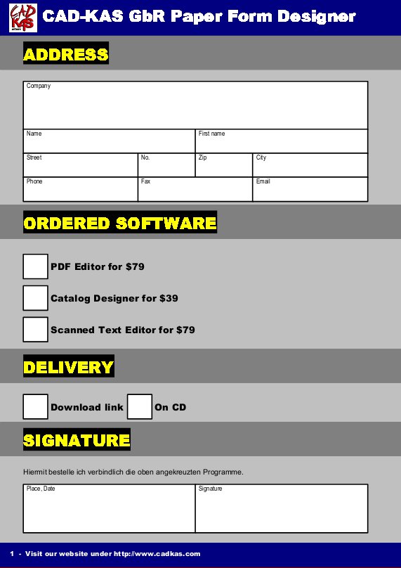 Possible fields are text fields or free size, checkbox fields and radio fields. You can sort the fields into different segments (categories). Write an introduction text for each of the segments or add an image for the segments. You can also include your company logo in the headline and a free text in the headline and footer of the page. Now the program will generate your paper form with one mouse click.