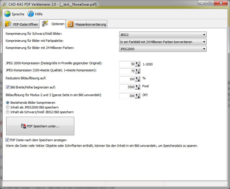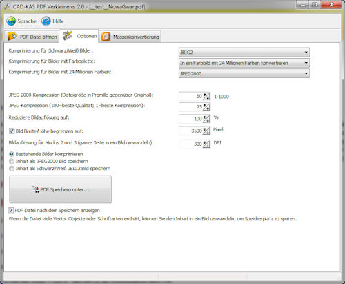 [mode] ist optional; folgende Werte sind definiert: 0=nur Bilder komprimieren 1=alles als JPEG2000 speichern 2=alles als JBIG2 speichern 0nojpeg2000=nur Bilder komprimieren aber keine JPEG2000 Kompression, sondern normale JPEG Kompression verwenden