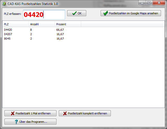Das Programm zeigt Ihnen auf einen Blick aus welchen Regionen Ihre Kunden kommen. Es kann die Postleitzahlen Regionen im Google Maps markieren und Ihnen dort die statistischen Informationen mit einblenden.