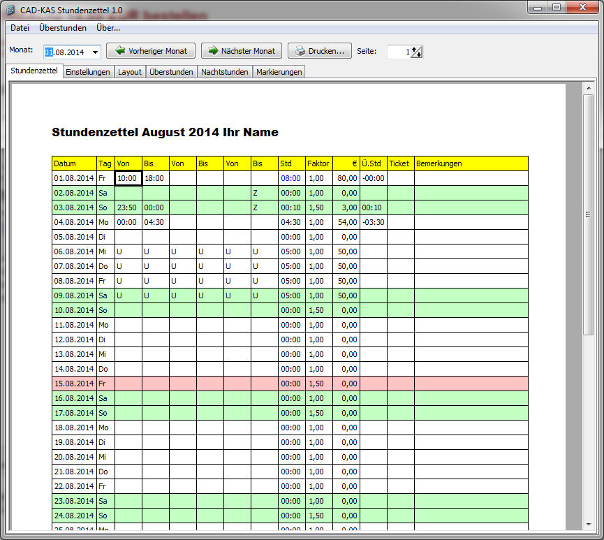 Es berechnet automatisch die Gesamtstundenzahl im Monat und kann auch den Lohn zusammenrechnen.