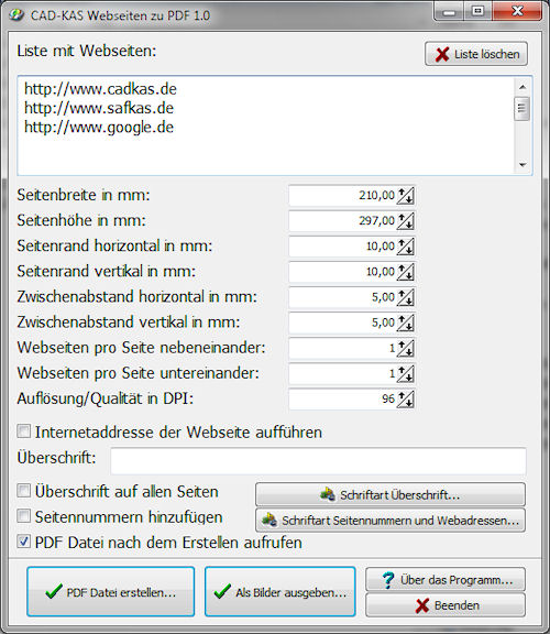 Die Anzahl der Webseiten pro PDF-Seite ist einstellbar. Sie können eine Überschrift anzeigen lassen und auch Seitennummern erzeugen. Die Internetadresse kann jeweils unter der Webseite ausgegeben werden.